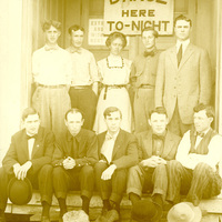 The Caniso Bunch of 1911 pose in front of a door to what may be a dance hall in Newport, Oregon. The man second from the left in the front row is Charles Walker. The man second from the left in the back row is Raleigh Walker. The woman next to Raleigh is Winnette Sears. The man on the far right in the back row may be Walter Sears. This photograph is part of the Charles Lovell and Winnette Sears Walker Collection. Winnette was a 1906 alumna of Linfield College. Charles was an alumnus of Tualatin Academy who later became a musician and an insurance agent in Hillsboro, Oregon.