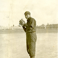 An unidentified man stands on the pitcher's mound with a baseball glove on one hand. This photograph was probably taken in Oregon. This photograph is part of the Charles Lovell and Winnette Sears Walker Collection. Winnette was a 1906 alumna of Linfield College. Charles was an alumnus of Tualatin Academy who later became a musician and an insurance agent in Hillsboro, Oregon.