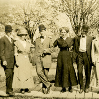 Six people pose outside together on a wooden board walkway, probably in Oregon. The woman on the far right is Winnette Sears. The rest remain unidentified. This photograph is part of the Charles Lovell and Winnette Sears Walker Collection. Winnette was a 1906 alumna of Linfield College. Charles was an alumnus of Tualatin Academy who later became a musician and an insurance agent in Hillsboro, Oregon.