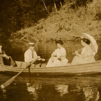 Two unidentified men and two unidentified women sit in a boat, probably in Oregon. This photograph is part of the Charles Lovell and Winnette Sears Walker Collection. Winnette was a 1906 alumna of Linfield College. Charles was an alumnus of Tualatin Academy who later became a musician and an insurance agent in Hillsboro, Oregon.