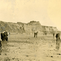 People look at rocks and shells on a beach, probably on the central Oregon coast. A wooden staircase appears in the background. This photograph is part of the Charles Lovell and Winnette Sears Walker Collection. Winnette was a 1906 alumna of Linfield College. Charles was an alumnus of Tualatin Academy who later became a musician and an insurance agent in Hillsboro, Oregon.