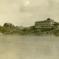 A photograph of Nye Beach in Newport, Oregon. Buildings pictured include: Nicolai Hotel (3-story light-colored building, left); Nye Beach Natatorium (low building with two large windows and a deck, center); and Dr. Minthorn's Hot Sea Baths (right). This photograph is part of the Charles Lovell and Winnette Sears Walker Collection. Winnette was a 1906 alumna of Linfield College. Charles was an alumnus of Tualatin Academy who later became a musician and an insurance agent in Hillsboro, Oregon.