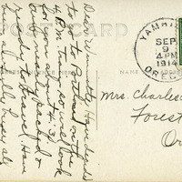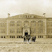 A photograph of students in front of McMinnville High School in Mcminnville, Oregon. This photograph was printed on postcard stock and includes a note from "Freda" to "Mrs Charles L. Walker". It is postmarked September 9, 1914. This photograph is part of the Charles Lovell and Winnette Sears Walker Collection. Winnette was a 1906 alumna of Linfield College. Charles was an alumnus of Tualatin Academy who later became a musician and an insurance agent in Hillsboro, Oregon.