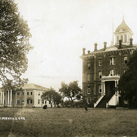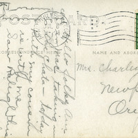 A photograph of "colleges at McMinnville Ore" (McMinnville, Oregon) or McMinnville College, now Linnfield. This photograph is printed on postcard stock and includes a note from "Freda" to "Mrs Charles Walker". It is postmarked July 8, 1913. This photograph is part of the Charles Lovell and Winnette Sears Walker Collection. Winnette was a 1906 alumna of Linfield College. Charles was an alumnus of Tualatin Academy who later became a musician and an insurance agent in Hillsboro, Oregon.