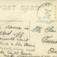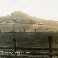 A photograph of prune orchards in North Yamhill, Oregon. This photograph is printed on postcard stock and includes a note to "Mr Chas Walker". It is postmarked October of 1912. This photograph is part of the Charles Lovell and Winnette Sears Walker Collection. Winnette was a 1906 alumna of Linfield College. Charles was an alumnus of Tualatin Academy who later became a musician and an insurance agent in Hillsboro, Oregon.