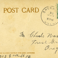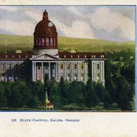 A postcard depicting the State Capitol building in Salem, Oregon. It includes a postmark from Sherwood, Oregon, but no year is present. The card was sent to "Mr Charls Walker". This postcard is part of the Charles Lovell and Winnette Sears Walker Collection. Winnette was a 1906 alumna of Linfield College. Charles was an alumnus of Tualatin Academy who later became a musician and an insurance agent in Hillsboro, Oregon.