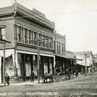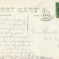 A postcard depicting Main Street in Silverton, Oregon. It includes a note to "Miss Winnette Sears" and is postmarked June 22nd, 1911. This postcard is part of the Charles Lovell and Winnette Sears Walker Collection. Winnette was a 1906 alumna of Linfield College. Charles was an alumnus of Tualatin Academy who later became a musician and an insurance agent in Hillsboro, Oregon.