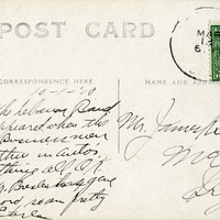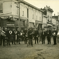 A photograph of the Lebanon Peerless Band on Main Street in Lebanon, Oregon. This photograph is printed on postcard stock and includes a note from "Earle" to "Mr. James K Sears". Earle is likely Walter Earle Sears, James K. Sears' son. This photograph is part of the Charles Lovell and Winnette Sears Walker Collection. Winnette was a 1906 alumna of Linfield College. Charles was an alumnus of Tualatin Academy who later became a musician and an insurance agent in Hillsboro, Oregon.