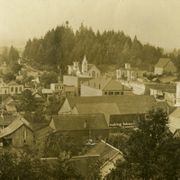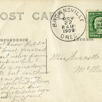 A birds-eye view of Brownsville, Oregon. This photograph is printed on postcard stock and includes a note from "Will" to Winnette Sears. It is postmarked November 22, 1910. This photograph is part of the Charles Lovell and Winnette Sears Walker Collection. Winnette was a 1906 alumna of Linfield College. Charles was an alumnus of Tualatin Academy who later became a musician and an insurance agent in Hillsboro, Oregon.