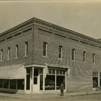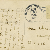 A man stands in front of a brick storefront, possibly a grocery store, in Rogue River, Oregon. It appears to be the same building that still stands at the intersection of Main and Broadway streets. This photograph is printed on postcard stock and includes a brief note from "Bernice" to "Mrs Chas. Walker". Bernice is likely Winnette Sears Walker's sister. It is postmarked August 6, 1914. This photograph is part of the Charles Lovell and Winnette Sears Walker Collection. Winnette was a 1906 alumna of Linfield College. Charles was an alumnus of Tualatin Academy who later became a musician and an insurance agent in Hillsboro, Oregon.