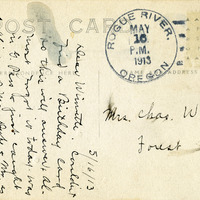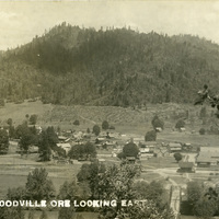 A birds-eye view of Rogue River, Oregon, or as it was called in the early 1900s, Woodville, Oregon. This photograph is printed on postcard stock and includes a note from "Bernice" to "Mrs Chas. Walker". It is postmarked May 16, 1913. This photograph is part of the Charles Lovell and Winnette Sears Walker Collection. Winnette was a 1906 alumna of Linfield College. Charles was an alumnus of Tualatin Academy who later became a musician and an insurance agent in Hillsboro, Oregon.
