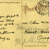A postcard depicting a Catholic Church in Albany, Oregon. It includes a brief note inquiring about some photographs and was sent to "Mr Chas. Walker". It is postmarked September 13, 1907. This postcard is part of the Charles Lovell and Winnette Sears Walker Collection. Winnette was a 1906 alumna of Linfield College. Charles was an alumnus of Tualatin Academy who later became a musician and an insurance agent in Hillsboro, Oregon.