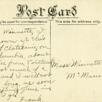 A postcard depicting a birds-eye view of Clatskanie, Oregon. It includes a note from "Frank" to "Miss Winnette Sears". This postcard is part of the Charles Lovell and Winnette Sears Walker Collection. Winnette was a 1906 alumna of Linfield College. Charles was an alumnus of Tualatin Academy who later became a musician and an insurance agent in Hillsboro, Oregon.