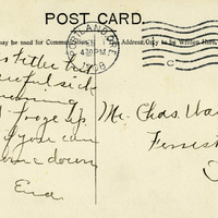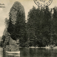 A postcard depicting a person canoeing in front of Rooster Rock on the Columbia River. It includes a note from "Eva" to Charles Walker and is postmarked February 1908. This postcard is part of the Charles Lovell and Winnette Sears Walker Collection. Winnette was a 1906 alumna of Linfield College. Charles was an alumnus of Tualatin Academy who later became a musician and an insurance agent in Hillsboro, Oregon.