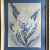 - Airbrushed watercolor on paper depicting four pale orchids. Framed.