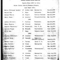 A photocopy of a document that was probably created sometime in mid-1912, titled "Deaths from 1900 to 1912, Salem Indian School, Chemawa, Oregon." This was created by the United States Indian Service of the Department of the Interior, which is the division of government that oversaw the school. The document lists the name, age, tribe, diagnosis and date of death for students who passed away at the school from 1900 through February, 1912. However, it should be noted that the list is incomplete; additional deaths are known to have occurred among students at Chemawa beyond the ones listed here.