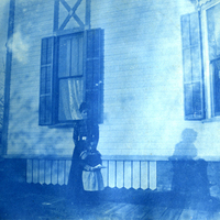 - A cyanotype photograph that features a woman and a little girl on a wood plank sidewalk next to a house. This photograph is part of the Nettie Shipley Haines photograph album.