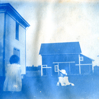 - A black and white photograph of two little girls playing next to two dwellings. This photograph is part of the Nettie Shipley Haines photograph album.