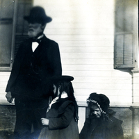 - A black and white photograph of Manley Shipley with his granddaughters, Ruth and Grace Haines, in front of a house. This photograph is part of the Nettie Shipley Haines photograph album.