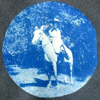 - A cyanotype photograph of a woman on horseback. This photograph is part of the Nettie Shipley Haines photograph album.