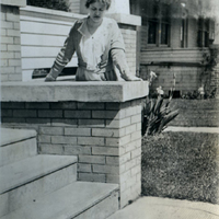 - A black and white photograph of Ruth Haines standing next to a porch. This photograph is part of the Nettie Shipley Haines photograph album.