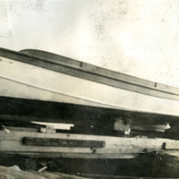 A black and white photograph of a wooden boat named "Ronomor" being launched into the water from a dock. The name appears to be based on the phrase "Row No More," probably referring the fact that the boat had a motor. This photograph was probably taken on the Oregon Coast circa 1910-1920.