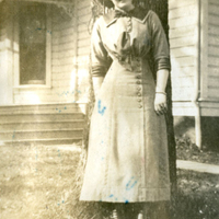 - A black and white photograph of Ruth Haines in front of a tree. A house is in the background. This photograph is part of the Nettie Shipley Haines photograph album.