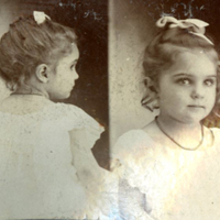 - A sepia photograph of a young girl. There are two different angles of the girl. One from the front and the other from the side. This photograph is part of the Nettie Shipley Haines photograph album.