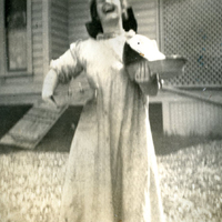 - A black and white photograph of a young woman laughing. She is holding two baking pans. This photograph is part of the Nettie Shipley Haines photograph album.