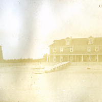 - A photograph of an Oregon Coast lodge or hotel at an unidentified location, possibly on an estuary or beach. A pier runs from the porch of the lodge towards the water. A wood-shingled water tower or tankhouse stands on the left. This photograph is part of the Nettie Shipley Haines photograph album.