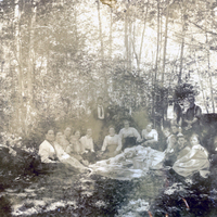 - A black and white photograph of a group of people having a picnic in the woods. This photograph is part of the Nettie Shipley Haines photograph album.