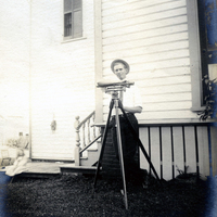 - A black and white photograph of a man leaning on a telescope. This photograph is part of the Nettie Shipley Haines photograph album.