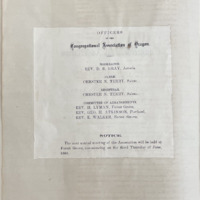 One part of a record book compiled by the Congregational Association of Oregon, with this part containing the minutes of the annual meeting held in 1867. The Association's members were church ministers and other delegates from Oregon and bordering areas. They met annually to share reports, promote Christian education, support special projects and address internal disputes. Some of the topics covered in this part of the record book include: -- Acceptance of routine reports; -- Reading of a special report from the Visiting Committee to Pacific University, praising its educational efforts but lamenting its remote location; -- Home Missionary Committee recommending the appointment of an Agent for the Pacific Northwest by the American Home Missionary Society, which would be filled by Thomas Condon; -- Resolution recommending that churches allow I.D. Driver, an agent of the American Bible Society, to speak in their pulpits and to solicit donations; -- Resolution in support of education; -- Report on the state of the church in Oregon, describing its growth but also the difficult conditions of low population and poor economic development; -- Resolutions on the sanctity of the Sabbath; -- Report in support of Temperance; -- Statistics of member churches and a reprinting of the Articles of Faith, Constitution and By-Laws.