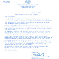 A letter to a congressional colleague from U.S. Congressman Les AuCoin regarding the Reagan administration's upcoming decision regarding action on draft registration policy, dated March 4, 1981. In the letter, Congressman AuCoin asked his colleague for support in "asking President Reagan not to back away from his campaign pledge to abolish registration for the draft." This is one of a collection of digitized objects from the Les AuCoin Papers (MS.147) at the Pacific University Archives. AuCoin served in the Oregon House of Representatives (1971-1975) and in the United States House of Representatives from Oregon's 1st District (1975-1993).