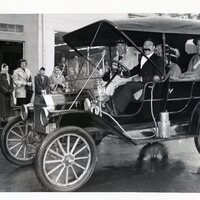 A black and white photograph taken by Allan J. de Lay featuring a 1911 Ford Model T at the Gay Nineties parade in the 1950s or early 1960s.
