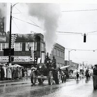 Traction engine passing by the First National Bank during the Gay Nineties parade