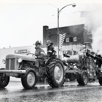 A black and white photograph by Allan J. de Lay featuring a tractor and a steam powered pumper (used by the fire department) passing by Goff's Pharmacy in downtown Forest Grove as part of the Gay Nineties parade. "Allan J. de Lay Professional Photographer -- Feb 25 1961" is stamped on the back of the print.