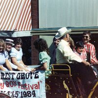 This is one photograph from a collection on the Gay Nineties festival and the the Original All-Northwest Barbershop Ballad Contest in Forest Grove, Oregon. The festival centered around a theme of nostalgia for the 1890s decade. The event, which ran from 1947 through the 1990s, featured a parade downtown, residents dressing up in 1890s-themed costumes for the celebrations, local businesses decorating their window displays, and the crown jewel of the event, the Original All-Northwest Barbershop Ballad Contest, which earned Forest Grove the nickname "Ballad Town U.S.A."