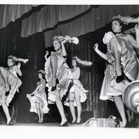 A photograph featuring can-can dancers performing at Forest Grove's Gay Nineties festival in the late 1950s or early 1960s. The photograph was perhaps taken by photographer Allan J. de Lay.
