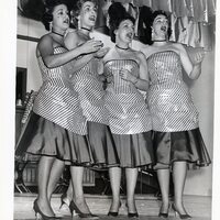 A black and white photograph by Allan J. de Lay featuring a women's barbershop quartet from Seattle performing at the All-Northwest Barbershop Ballad Contest in the 1950s or 1960s. The name of the quartet is unknown.