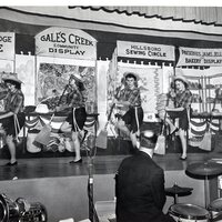 A black and white photograph by Allan J. de Lay featuring a women's dance routine performing at the 1961 Gay Nineties festival in Forest Grove. The group is likely performing at a theater in a local school. The names listed on the artistic backdrop in the photograph signify that the event was attended by the residents of the nearby communities of Gales Creek and Hillsboro.