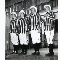 A black and white photograph by Allan J. de Lay featuring an unnamed quartet from Seattle performing at the 1960 All-Northwest Barbershop Ballad Contest.