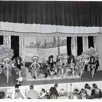 A black and white photograph featuring can-can dancers performing at Forest Grove's Gay Nineties festival. As the photograph was taken at the old Forest Grove high school auditorium located on Elm Street, it can be established that the photograph was taken between 1947 and 1953. The photographer is unknown, but it may have been Allan J. de Lay, a staff photographer for The Oregonian who took numerous photographs of the event over the years.