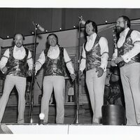 A black and white photograph featuring the Jackson Co. Roadshow from Medford, Oregon performing at the 1977 Barbershop Ballad Contest. The photographer is unknown, but it may have been Allan J. de Lay, a staff photographer for The Oregonian who took numerous photographs of the event over the years.