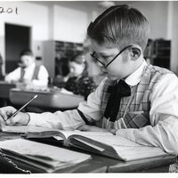 A 1958 photograph taken of student Tom Spreng at a Forest Grove elementary school during the Gay Nineties festival. "Allan J. De Lay staff photographer The Oregonian" is stamped on the back of the print, so it is likely that this photograph was taken for the newspaper.