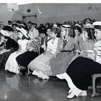 A black and white photograph by Allan J. de Lay featuring elementary school students dressed up in Gay Nineties attire at a school assembly in 1961.