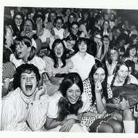 A black and white photograph by Allan J. de Lay featuring a Gay Nineties-themed school assembly in 1972.