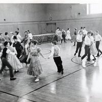 A black and white photograph featuring a Gay Nineties-themed dance for students in the Central School gymnasium in 1961. The photographer is unknown, but it may have been Allan J. de Lay, a staff photographer for The Oregonian who took numerous photographs of the event over the years.
