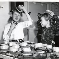A black and white photograph featuring elementary school students trying on miniature, homemade, Gay Nineties-themed hats. The photographer is unknown, but it may have been Allan J. de Lay, a staff photographer for The Oregonian who took numerous photographs of the event over the years.