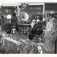 Gay Nineties parade float with a phonograph and Victorian-era pump organ